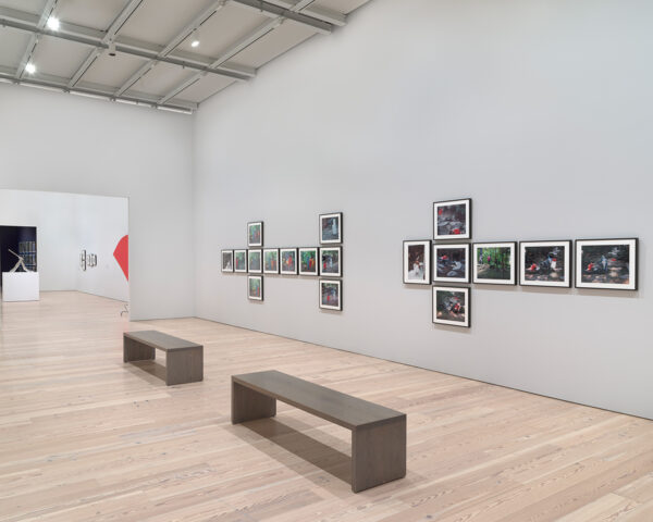Installation view of Inheritance (Whitney Museum of American Art, New York, June 28, 2023—February, 2024.). From left to right: Hank Willis Thomas, Strike, 2018; Carissa Rodriguez, Not Yet Titled (Red Curve), 2015; Lorraine O’Grady, Rivers, First Draft, 1982, printed 2015. Photograph by Ron Amstutz.
