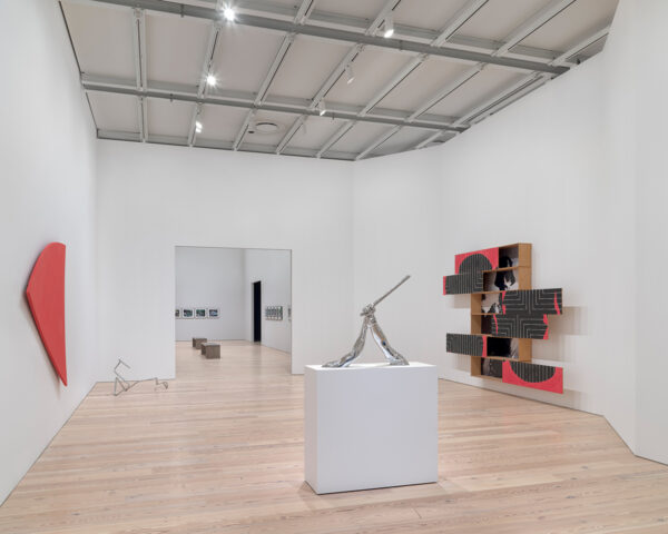 Installation view of Inheritance (Whitney Museum of American Art, New York, June 28, 2023—February, 2024.). From left to right: Carissa Rodriguez, Not Yet Titled (Red Curve), 2015; Wade Guyton, Untitled Action Sculpture (Breuer), (2003); [in back] Lorraine O’Grady, Rivers, First Draft, 1982, printed 2015; Hank Willis Thomas, Strike, 2018; Joan Wallace, Bob’s your Uncle, 1991. Photograph by Ron Amstutz.